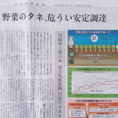 写真②の新聞記事(日本経済新聞10月27日)では日本国内の種自給率はたったの10%程度と報じています!